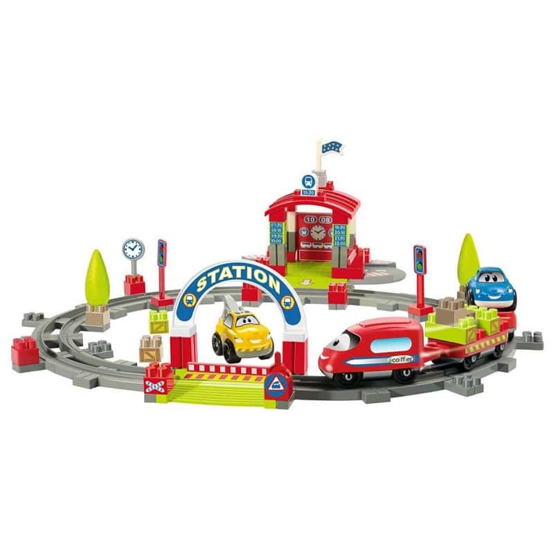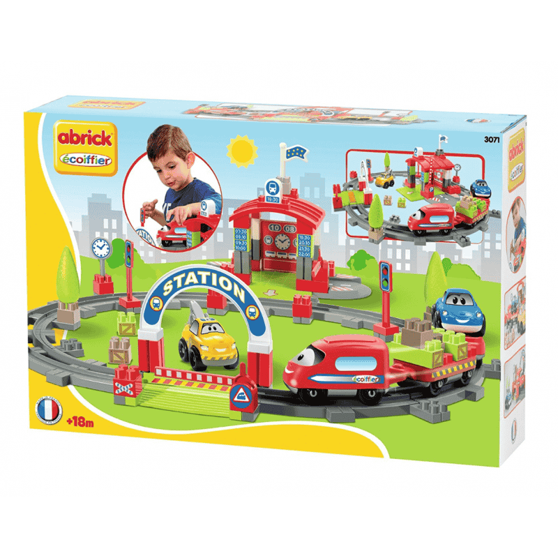 Una estación para construir con un tren, dos coches, arboles, señales, puertas levadizas y muchos mas accesorios.