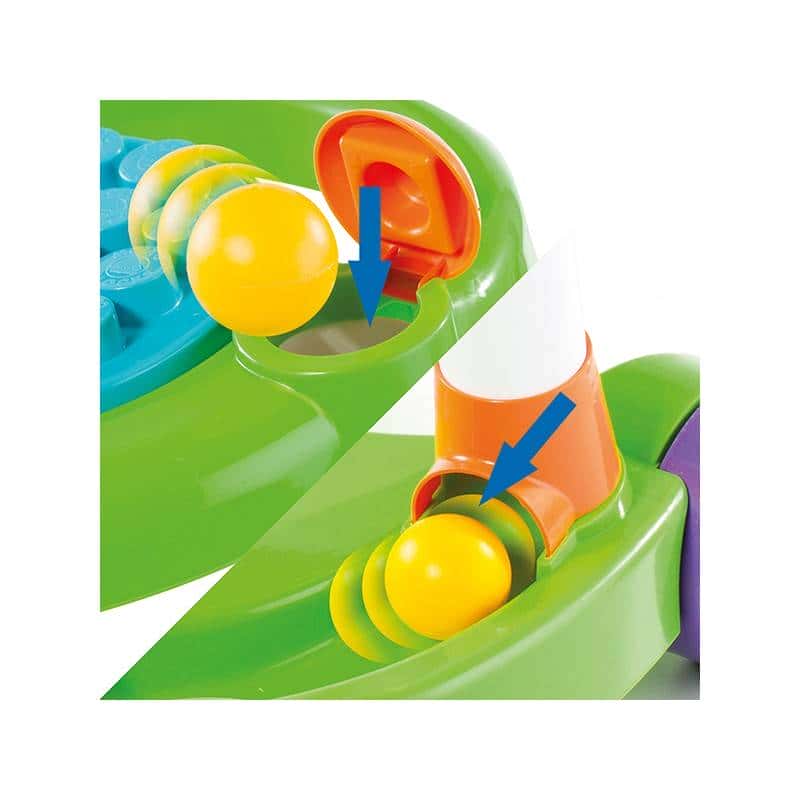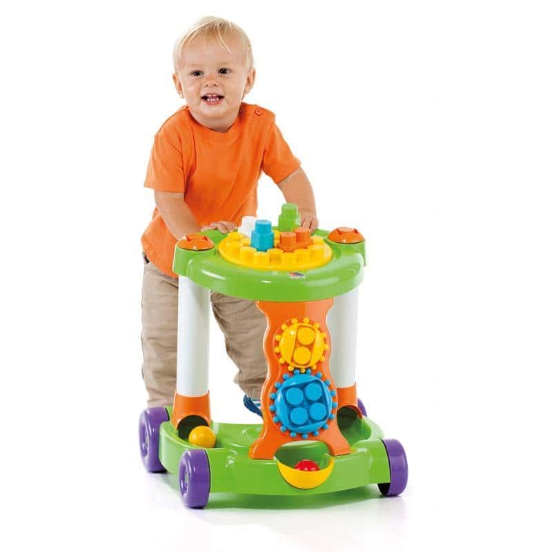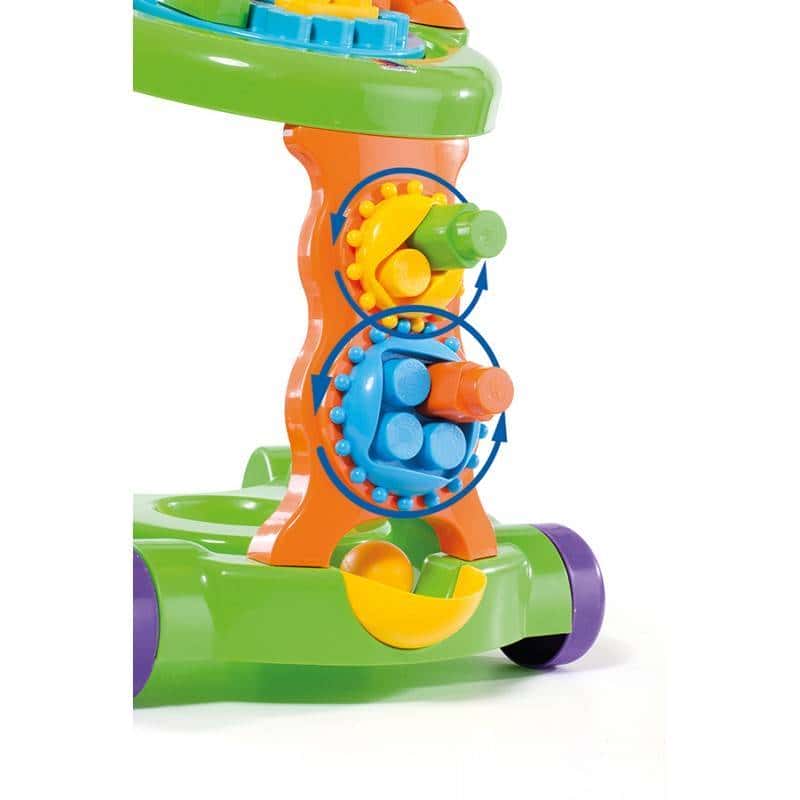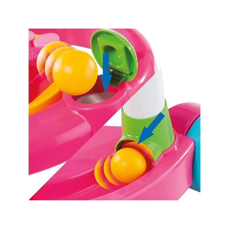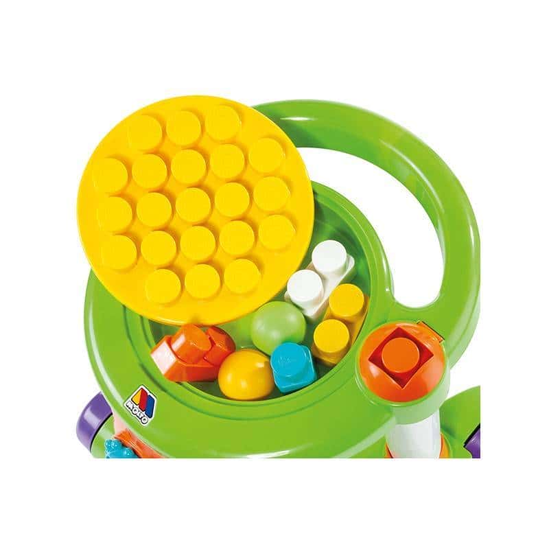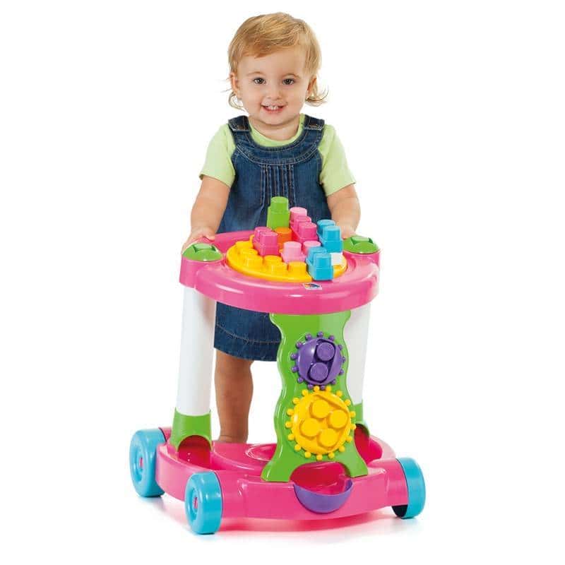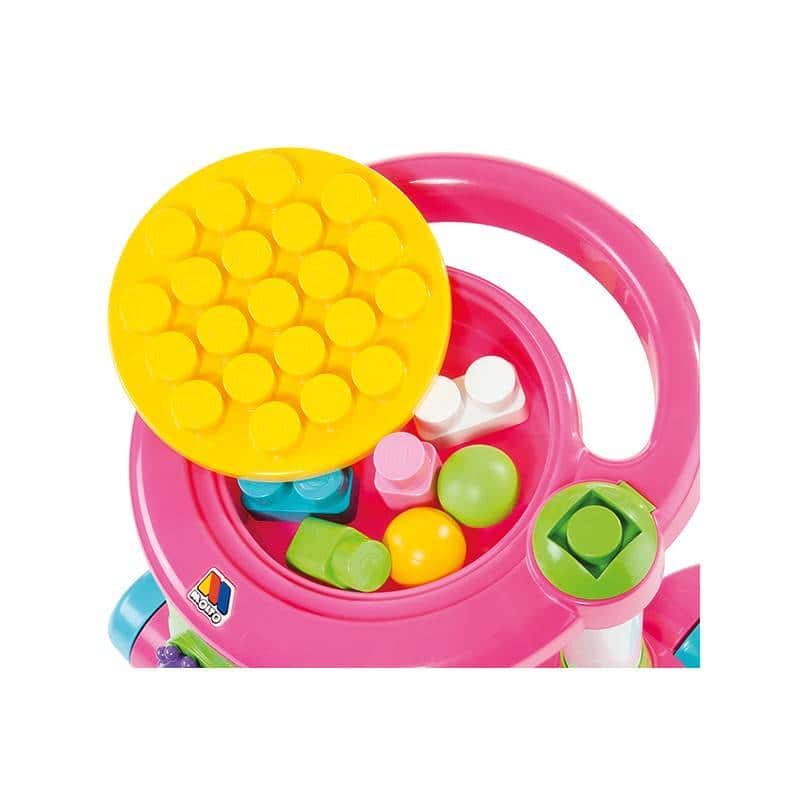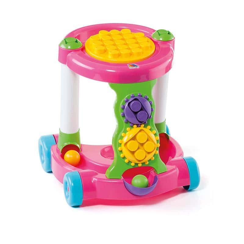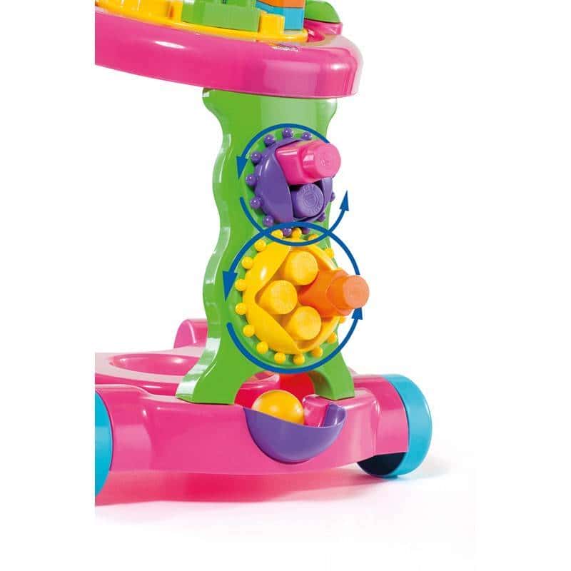 Un andador con mesa de bloques para jugar de color rosa y lima, especial para niñas/os. Con ruedas divertidas, lanza bolas por sus toboganes, abre su tapa y juega con los bloques.