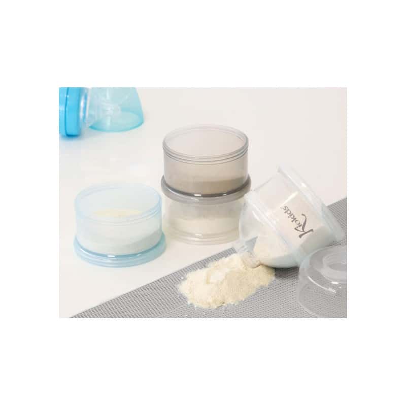 Está compuesto de 4 compartimentos. Además del cierre en rosca entre depósitos semitransperentes, y el último además se cierra con un embudo que permitirá verter la leche en polvo directamente en el biberón con comodidad y rapidez.