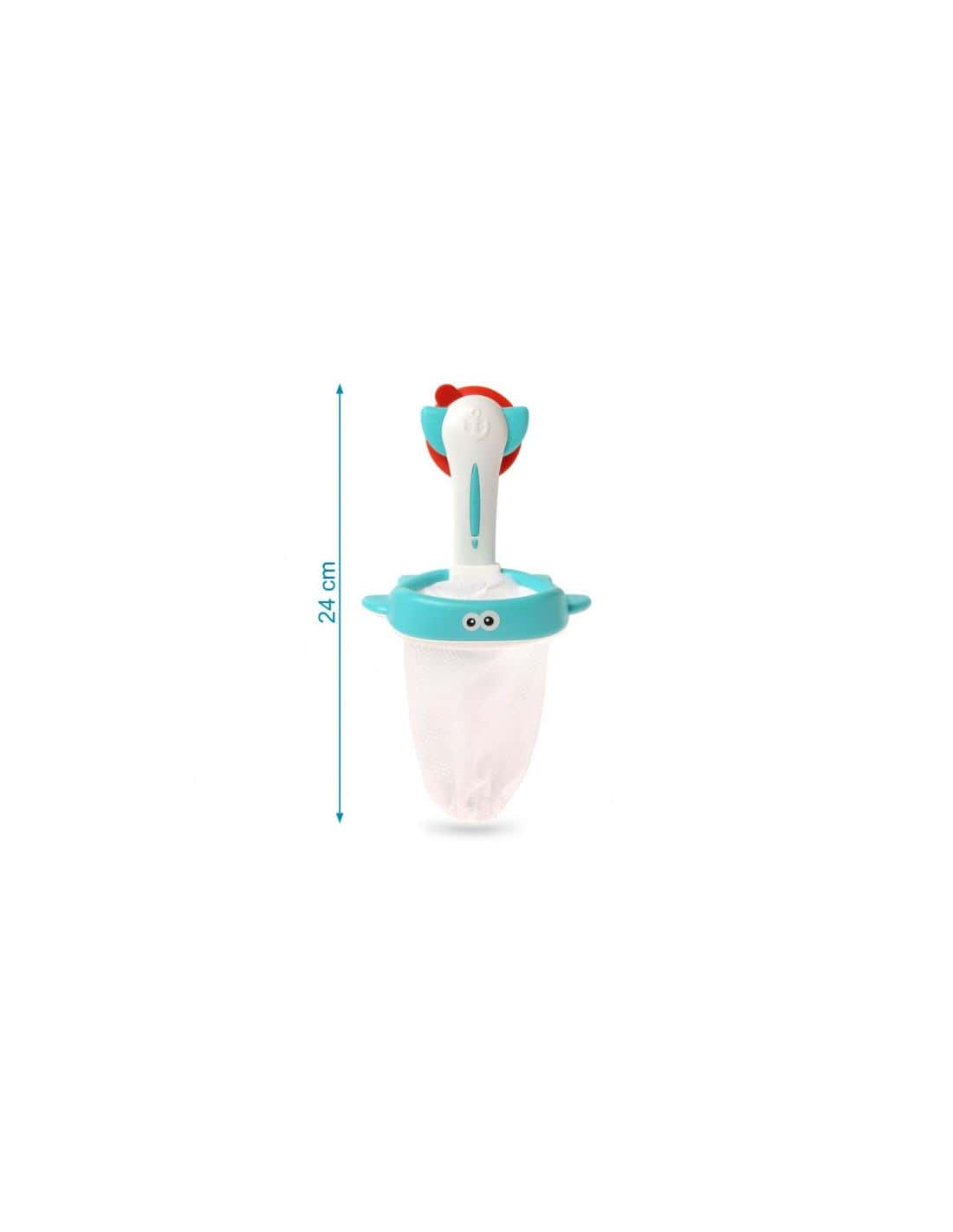 Tiene 3 animalitos marinos que son pelotitas y una canasta hecha con una red resistente con ventosa para fijar en la bañera o la pared de la ducha. Se lo pasará tan bien que se le hará corto el baño.