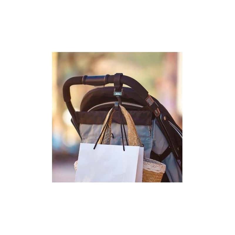 Pareja de prácticos ganchos porta bolsos. Válidos para que el bolso se adapte al carro o silla de paseo y también para llevar las bolsas de la compra, ya que el cestillo del carrito resulta generalmente insuficiente. Da igual el tipo de chasis o el cochecito: nuestros porta bolsos incorporan un sistema de velcro que los hace totalmente universales. Incorporan un sistema de rotación de 360º