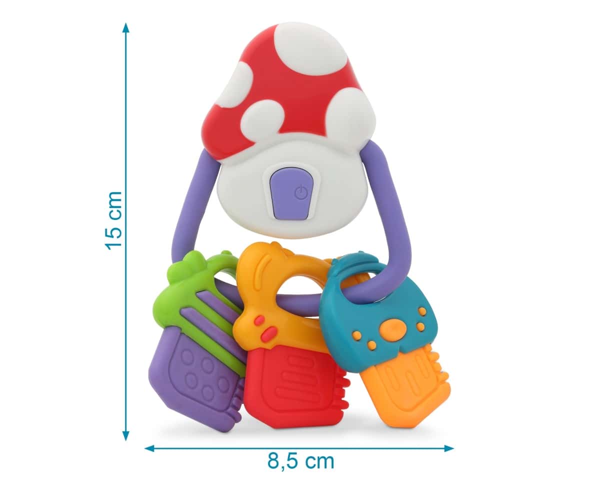 Como sonajero interactivo, es un juguete que más entretiene a los bebés, y si es con forma de llaves, se convierte en un imprescindible. Nuestra seta además tiene música al apretar en la puertecita y las llaves son blanditas para que las pueda morder y usarlas como mordedor. Cuando aprieta la puertecita suenan 12 melodías diferentes, la diversión está asegurada.