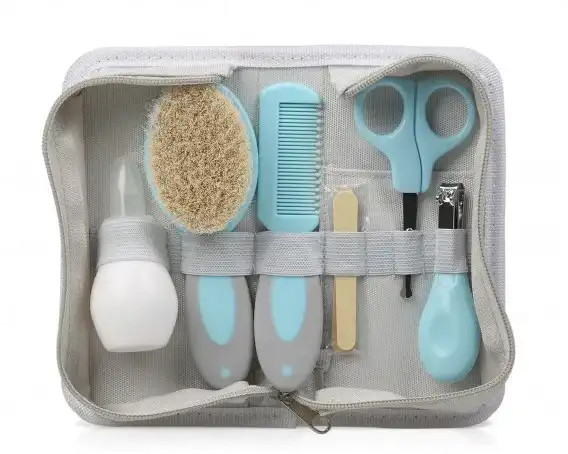 Unas tijeras con la punta redondeada para mayor seguridad; un cortaúñas con mango ergonómico para un agarre más cómodo y seguro; y un set de limas pequeñas. Finalmente también incorpora una perilla nasal con tapa de protección.