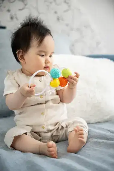 Este sonajero es liviano con colores brillantes y atractivos. Está cubierto de relieves para descubrir y suena cuando el bebé lo sacude. Este sonajero se adapta a todas las etapas del manejo del bebé.
