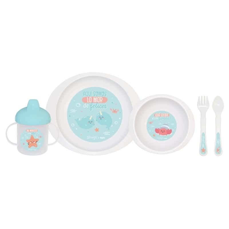 Compuesta por plato, bol, taza antigoteo, cuchara y tenedor.
