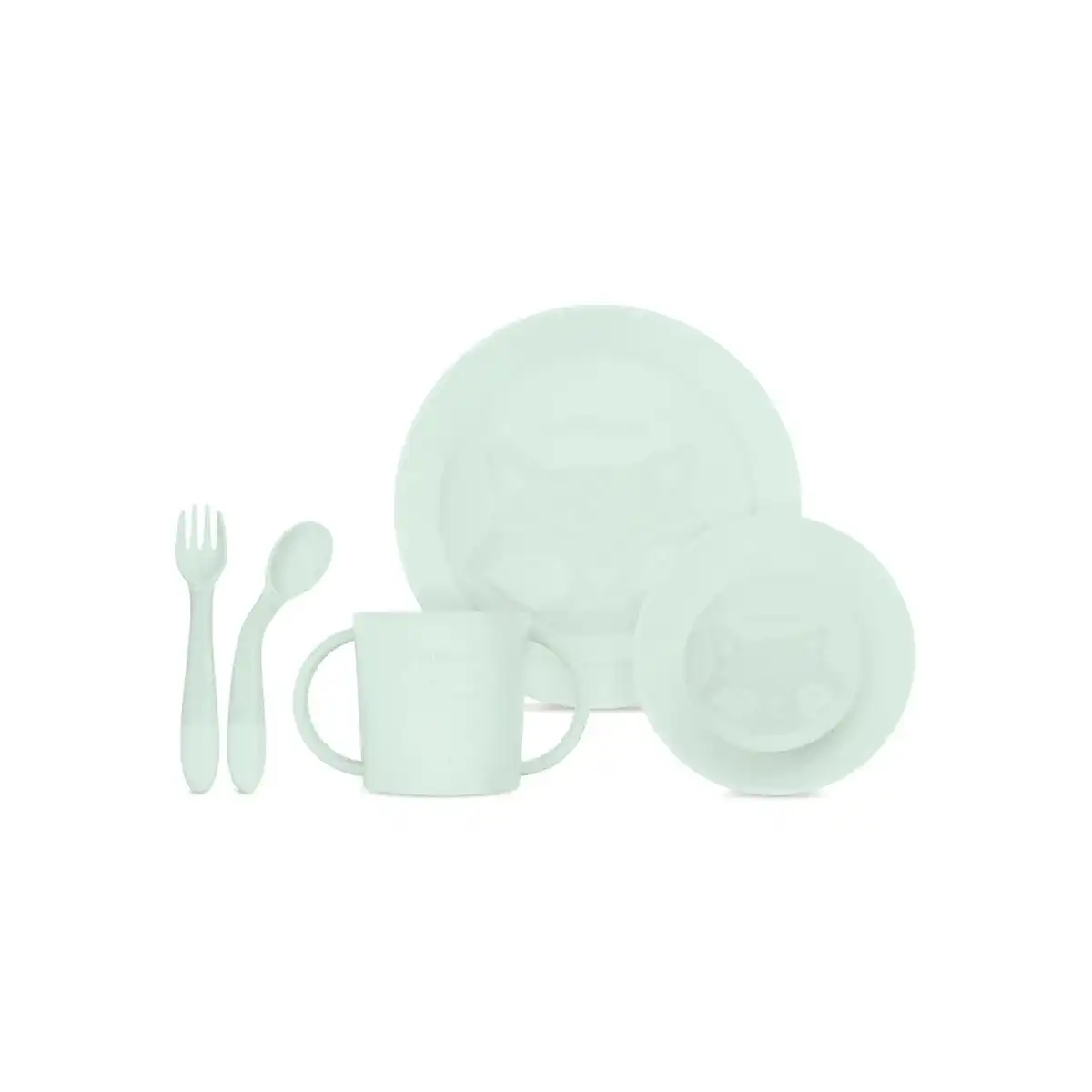 Vajilla infantil de platos redondos muy completa. En ella, encontrarás un plato, un bol, cubiertos anatómicos cortos y flexibles, así como un vaso con asas. Está tematizada con un animalito y suave color mint. Esta ideada para que la puedan usar de forma autónoma los niños pequeños, con diversidad funcional o discapacidad visual. Está hecha en España y, gracias a sus materiales, podrás calentar la comida en el microondas y limpiarla en el lavavajillas.